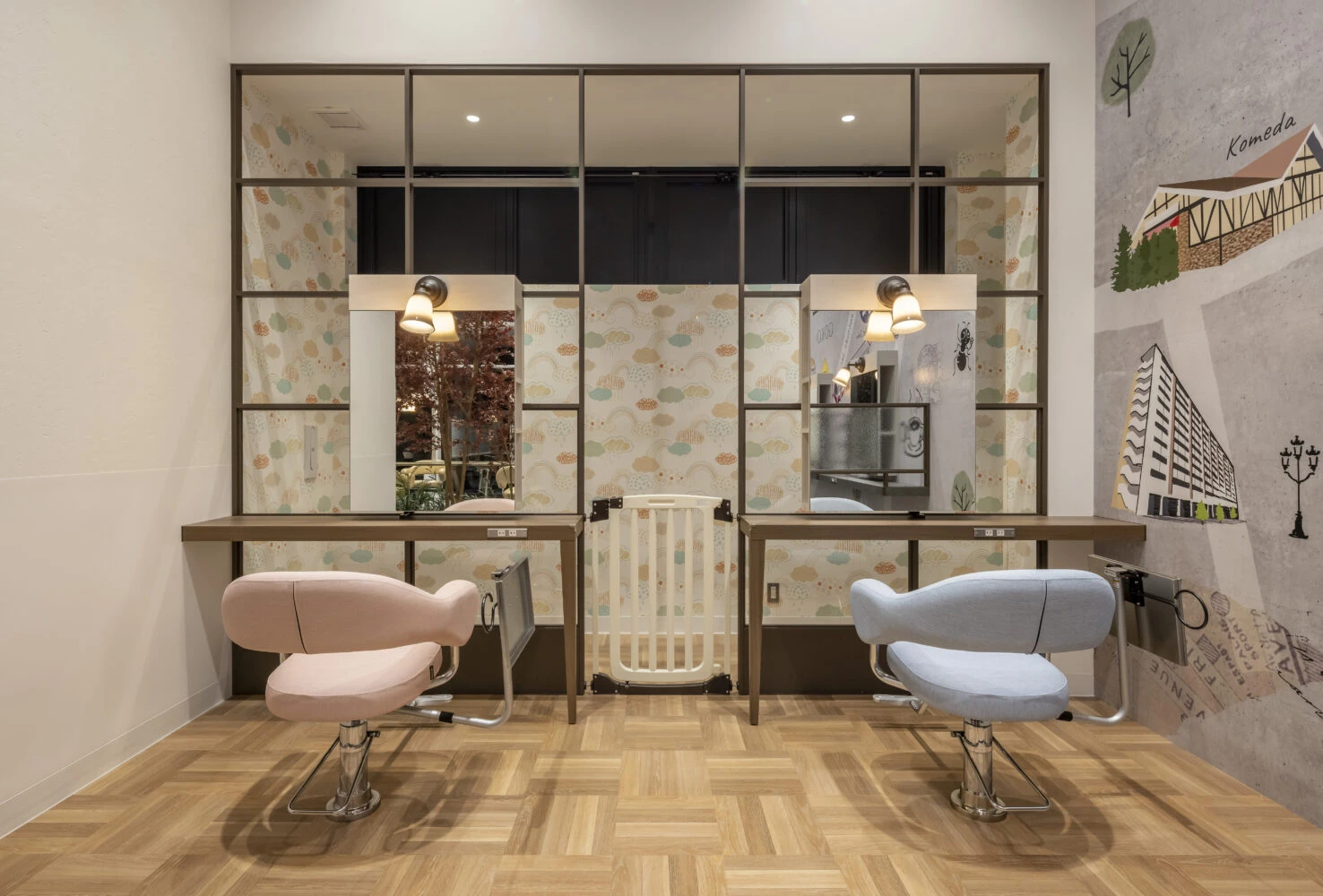 お子様連れでも安心のキッズスペース、男性も大歓迎のメンズブースも完備しております。
