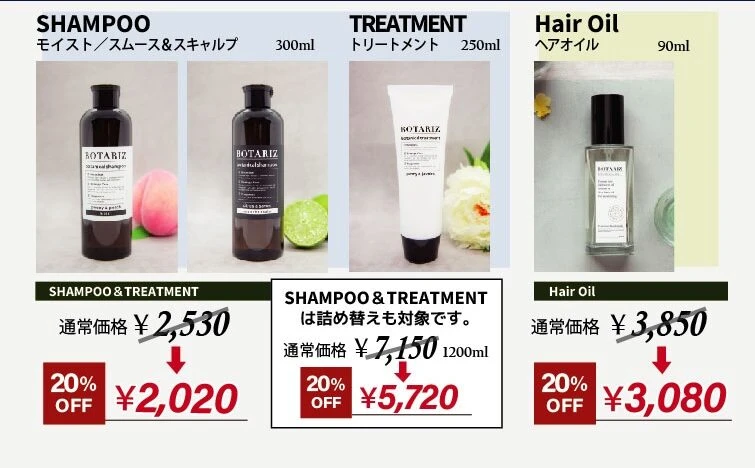 モイスト、スムース&スキャルプと共に使うことで香りが髪に定着しやすく、植物由来の香りを長く楽しむことが出来ます。