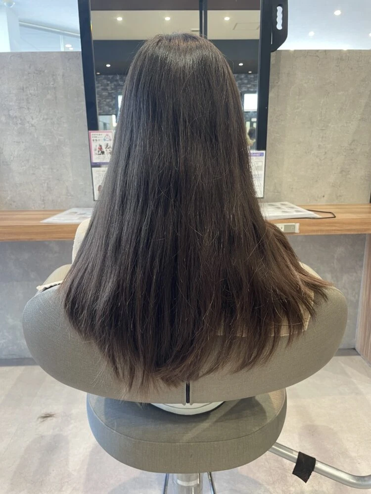 多毛で膨らむので毎回すいて貰っていたそうです。 根元の方に10センチ位まですいた髪の毛が沢山あり、長いのに軽くなっている為、毛先の量はほとんどない感じでした。 これ以上、毛量を減らしても解決にはならないので、今の状態を説明して縮毛でご来店して頂きました。