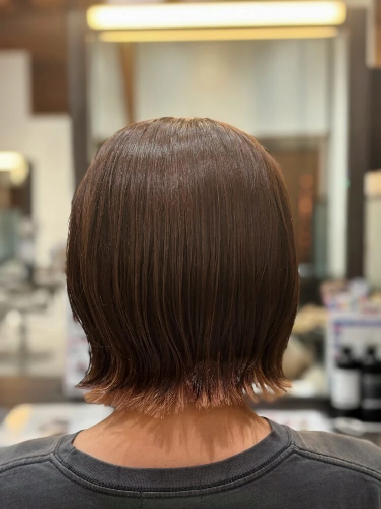 カットだけだと重くなりがちなボブスタイルも、 ゆるく動くパーマで軽やか&抜け感のある仕上がりに◎ パーマをかけることで、朝のセットも簡単!時短でおしゃれヘアが完成します。 ムースを使えば濡れ感もキープでき、艶も出てこなれ感UP。 髪の量が多くて広がりやすい方にもおすすめのデザインです!