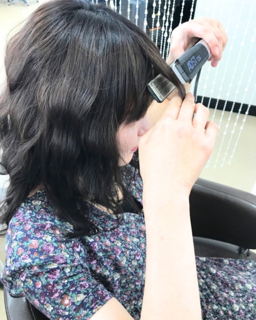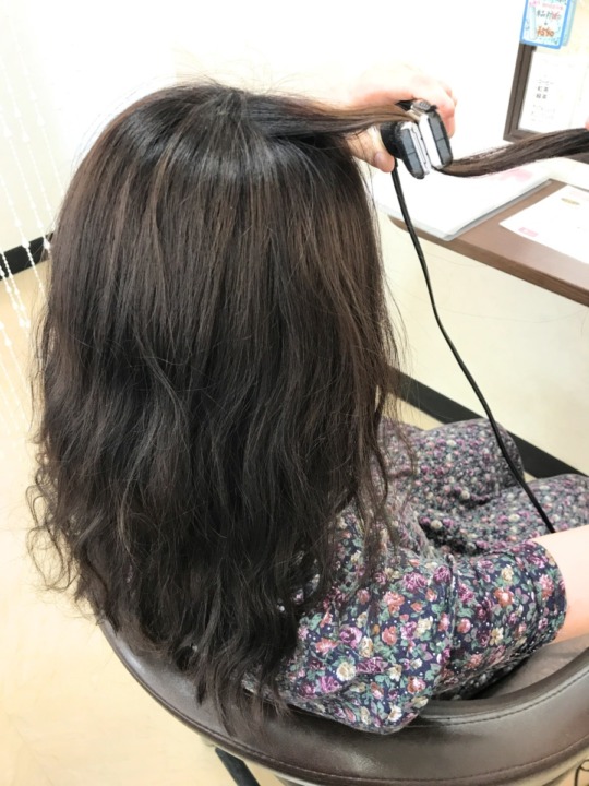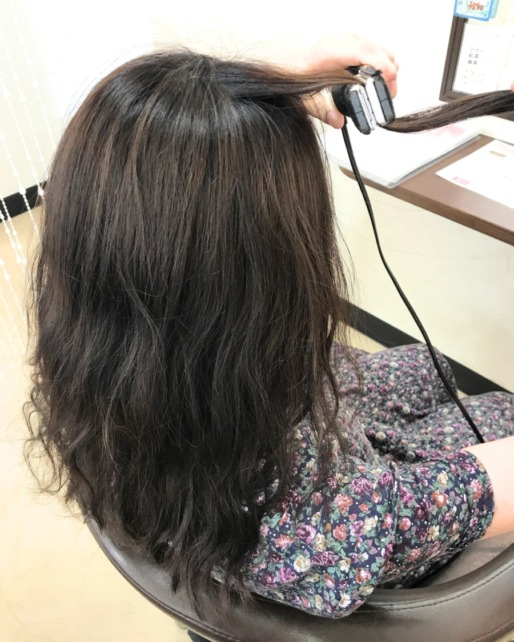 ストレートアイロンで波巻きにし、うねりをつくっていきます。 -