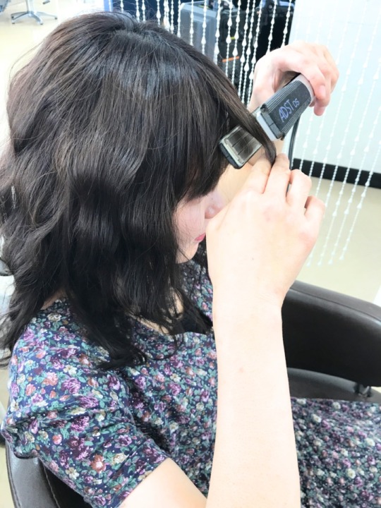 前髪も毛先を丸めると全体のバランスに合うので巻いていきます。 毛先だけ巻くのがポイントです -