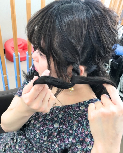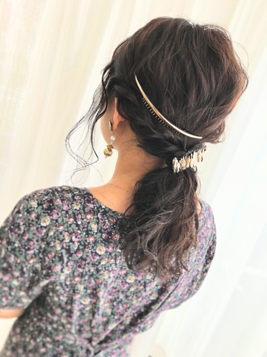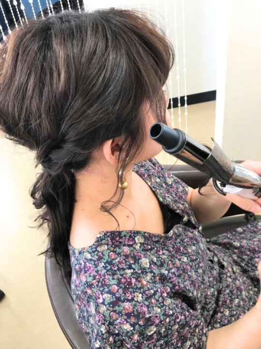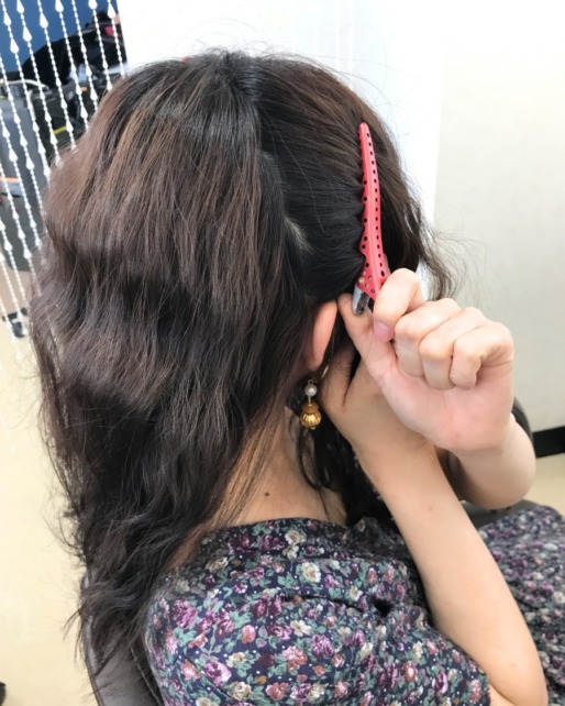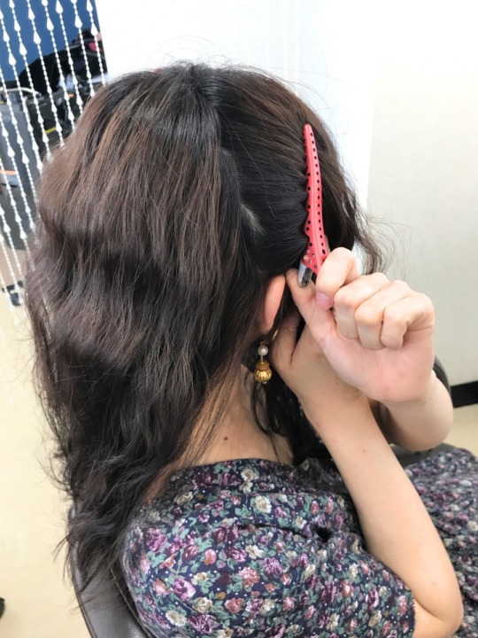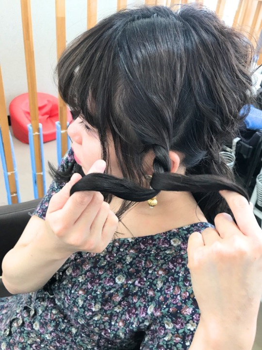 後れ毛はコテを使ってふわふわに巻いておきます。 完成になります。