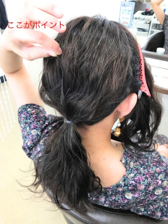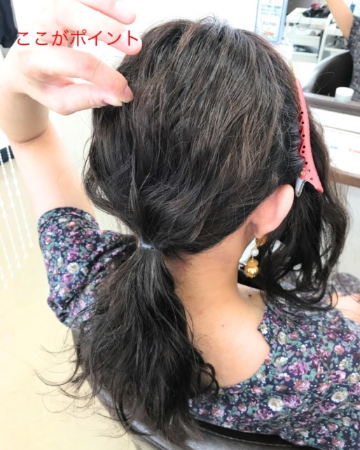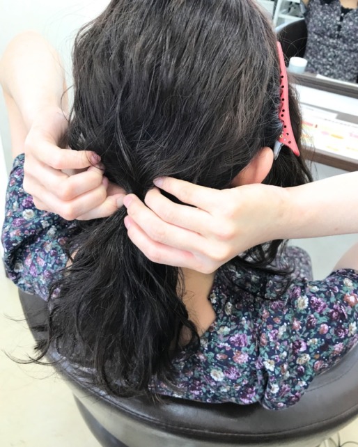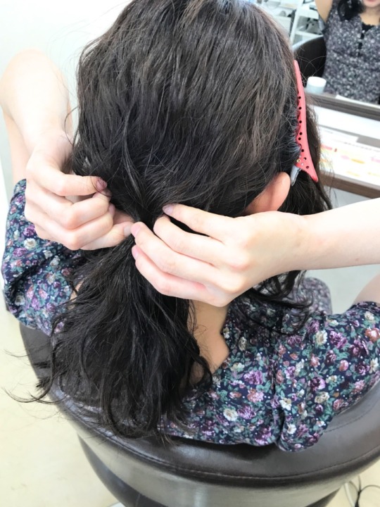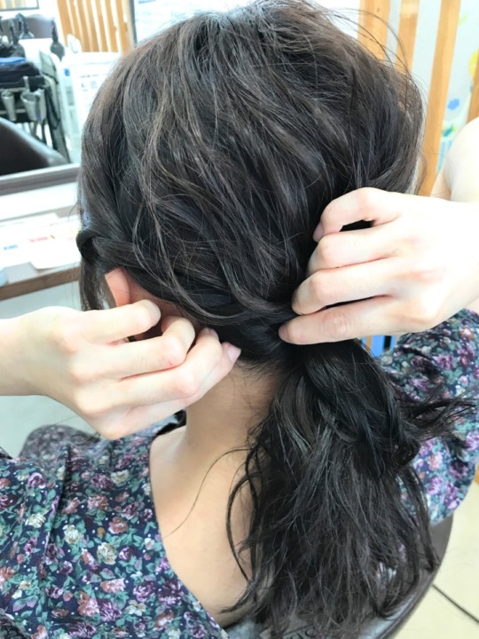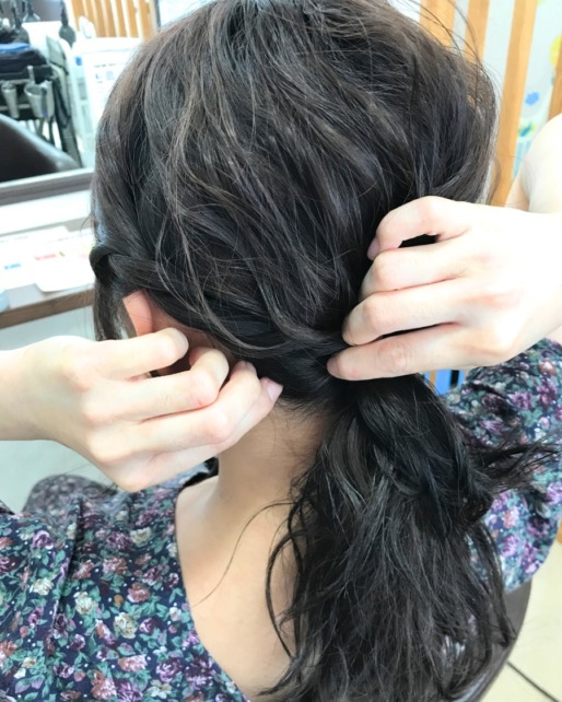 ねじったサイドの毛束は後ろで結んだ場所にとめてゴムが見えないように重ねます。 -