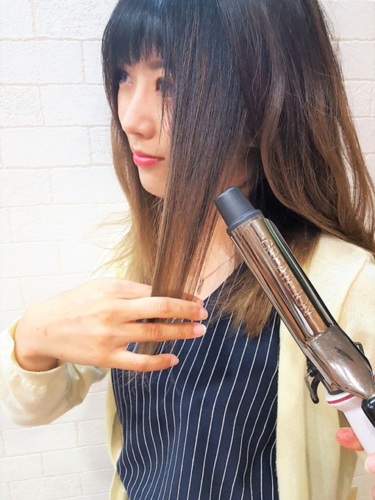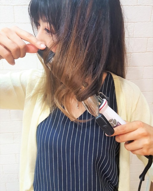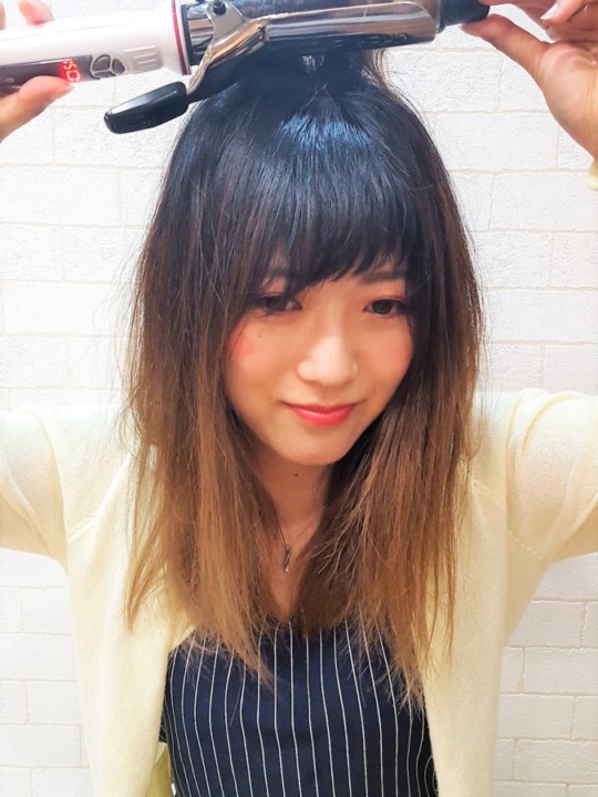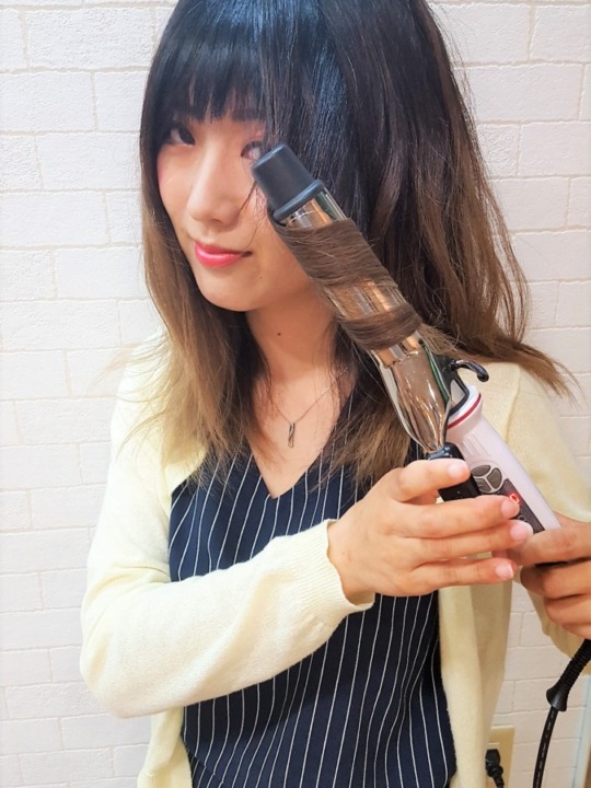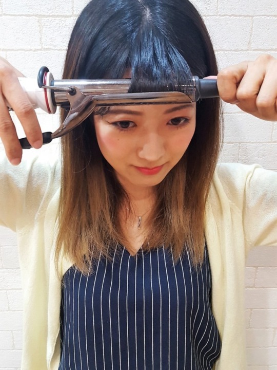 まずは前髪♪ 作りやすい所から作っちゃいましょう! 前髪は前髪だけ分けとり、軽くコテ跡がつかないように巻き込みます。 -