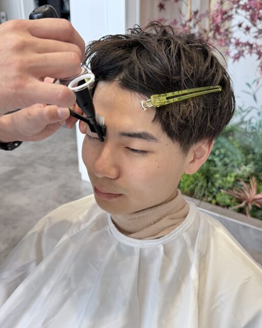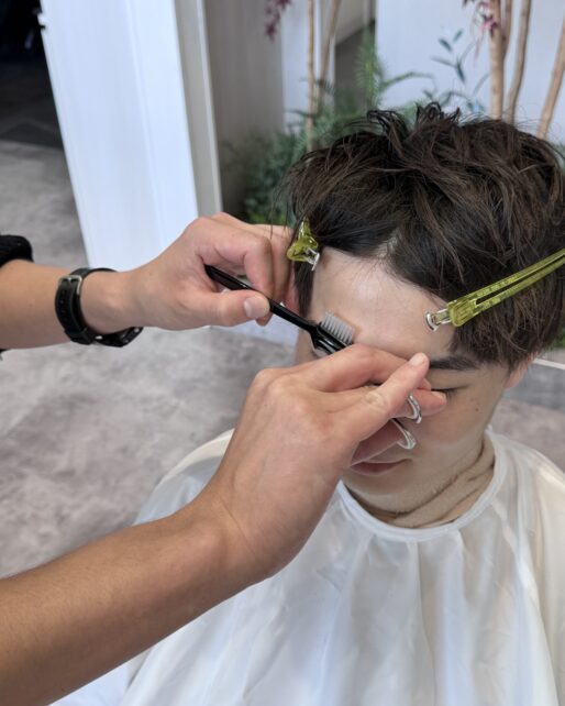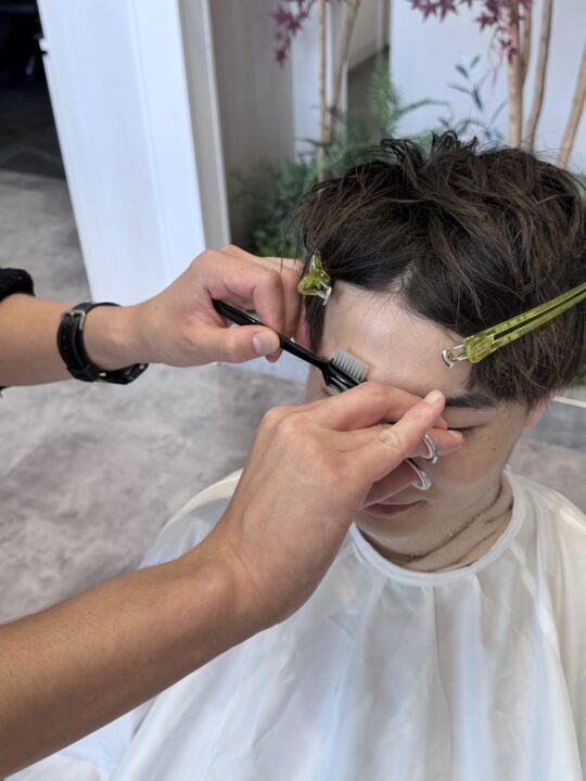 専用のコームとハサミを使って、長さを整えていきます。 長さを整えることで均一な色の濃さにして清潔感を出していきます。 -