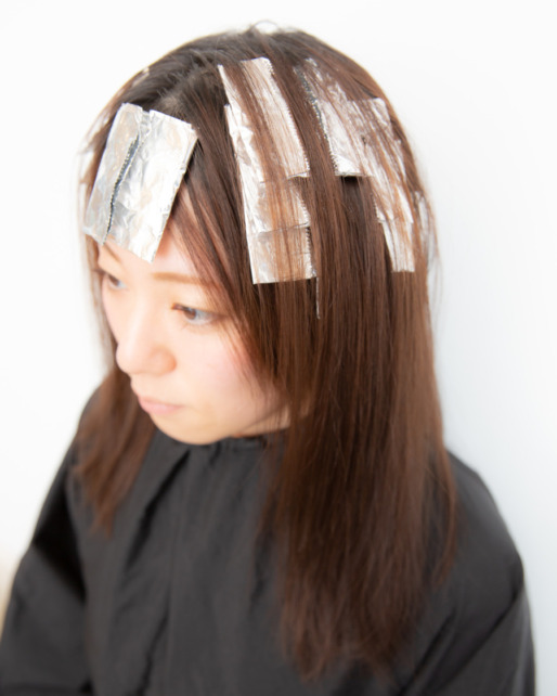 根元のカラーを塗り終えた後は、顔周りにホイルでハイライトを行なっていきます。 根元のカラーが染まるまでの時間で行なっていくので、時間的な負担はほとんどありません。