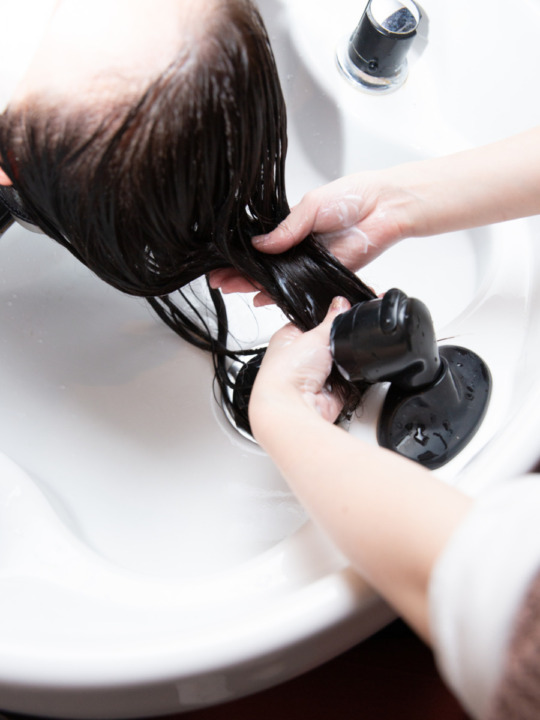 しっかりとお薬を揉み込み、髪に浸透させていきます。 その後髪をキレイに流してシャンプーは終了となります。 -