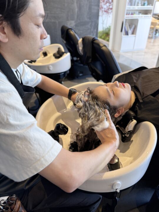 ヘッドマッサージを行なっていきます。Wizのシャンプーにはヘッドマッサージがついているので頭皮の凝りなどを同時にほぐしていきます。(学生様はついておりません) -