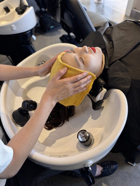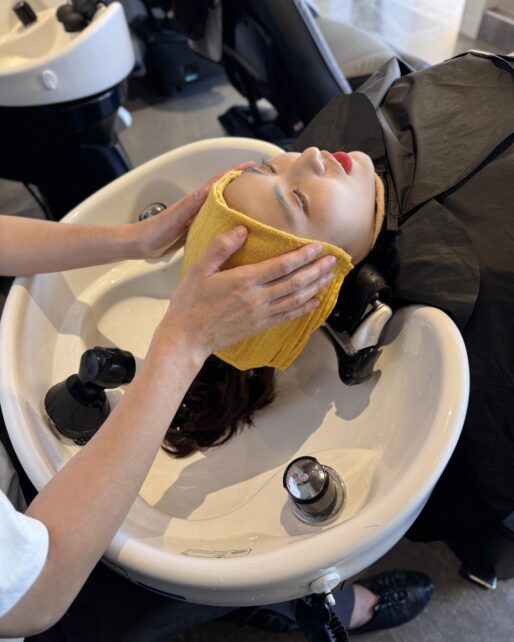 シャンプーが終わったらトリートメントを塗布してから温めたタオルで頭を包んでいきます。頭皮を温めることで血流がめぐりやすくなります。 -