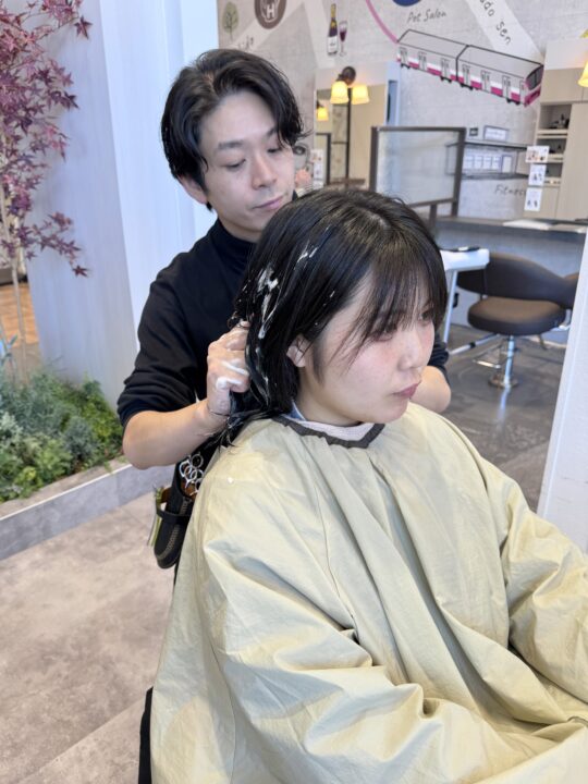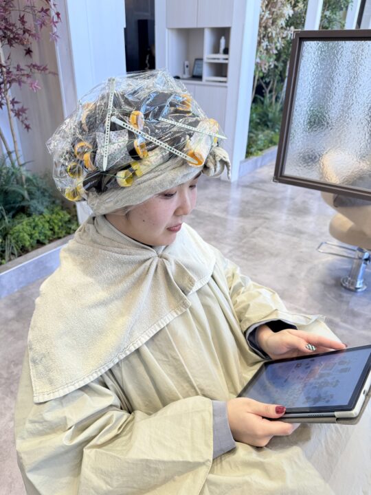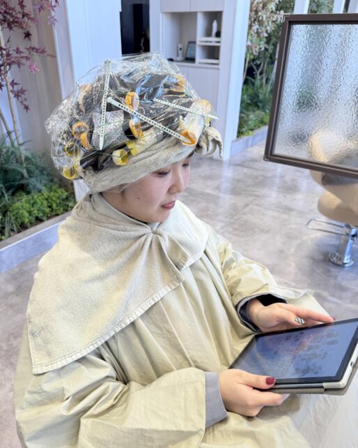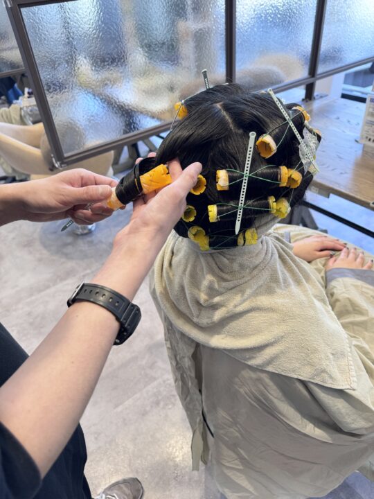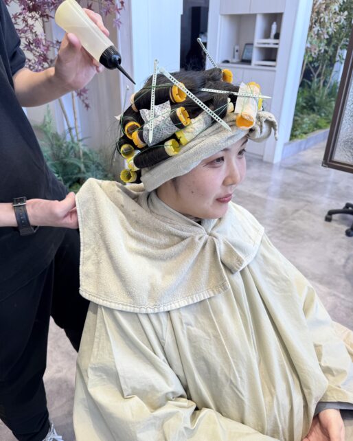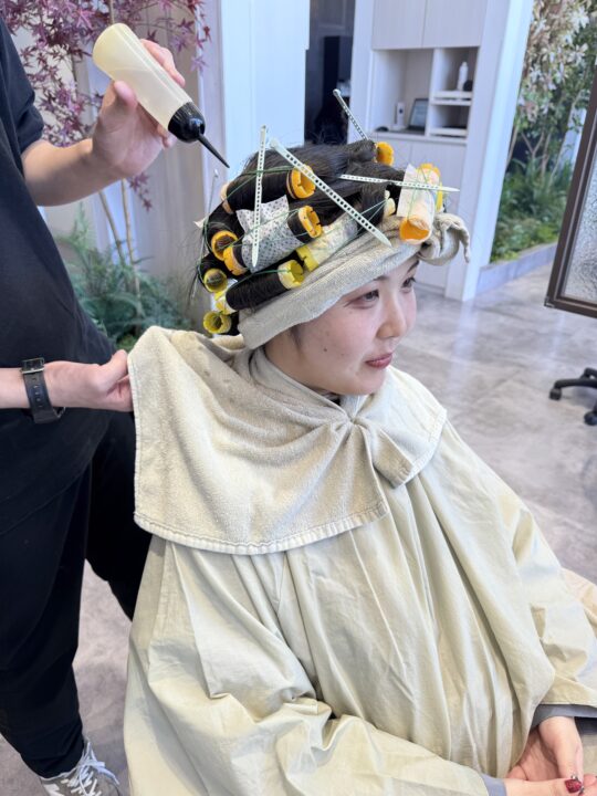 パーマのかかり具合をチェックします。かかっていたら形を固定する2剤を塗布していきます。2剤をつけた後は5分ほど時間を置いていきます。 -