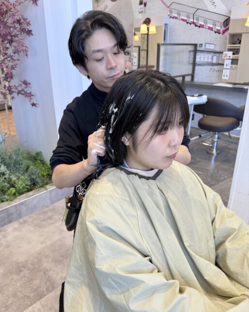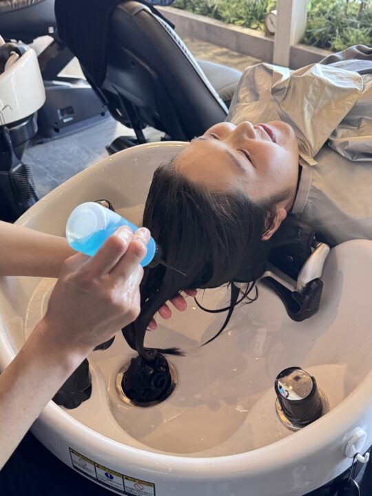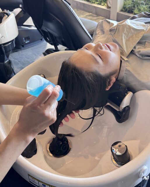 5分放置後、ロッドアウトしてシャンプー台に移動します。水洗する前にパーマ液の臭いが残らないようにバッファー剤を塗布していきます。 -