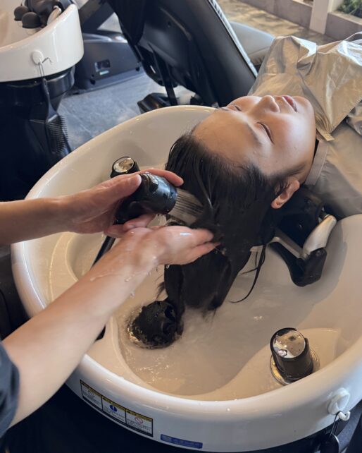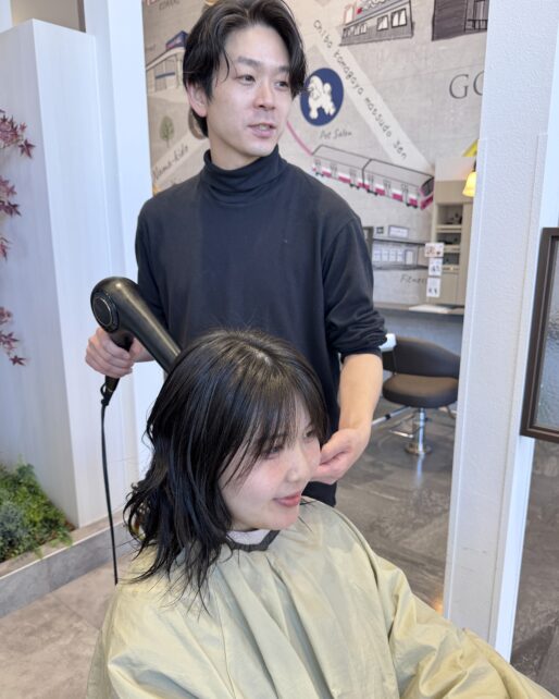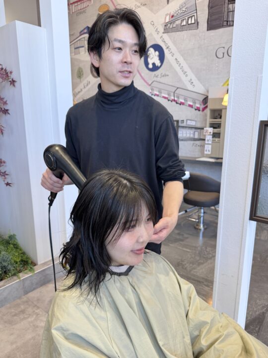 水洗が終わったらドライをしていきます。パーマの場合は少し弱めの風でドライヤーを当てていくとカールの形をキープすることができます。 -