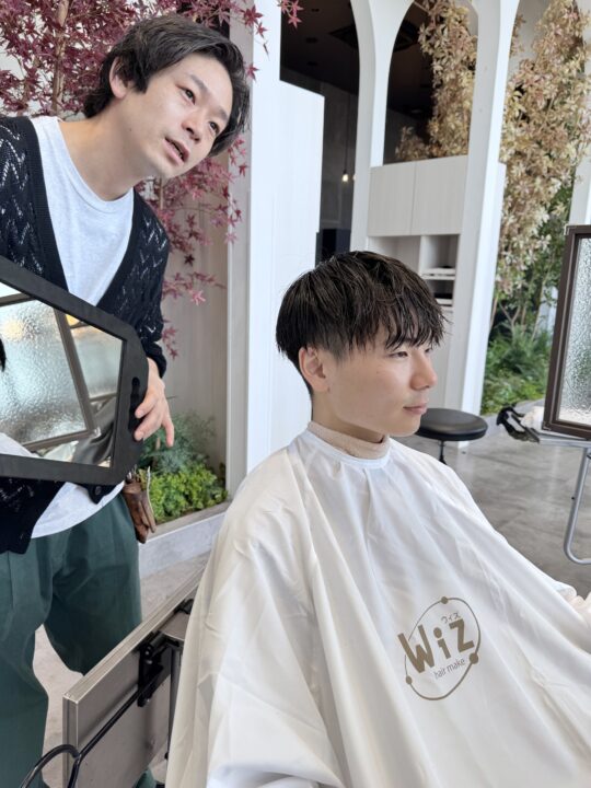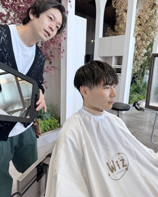 最後に全体の確認をしていただきます。長さや毛量などもう少し切りたいなどご要望があれば遠慮なくお伝えください。Wizでは様々なアフターサービスをご用意しております。 次回来店日の目安やお家でのお手入れ方法などもしっかりとお伝えさせていただきます。