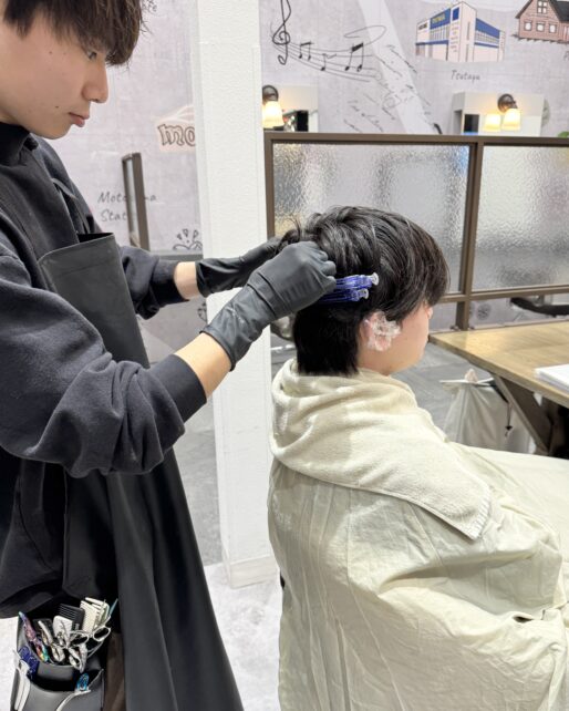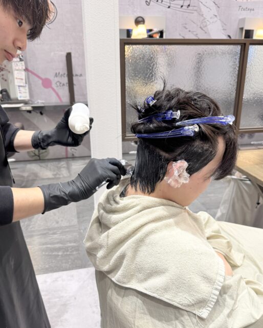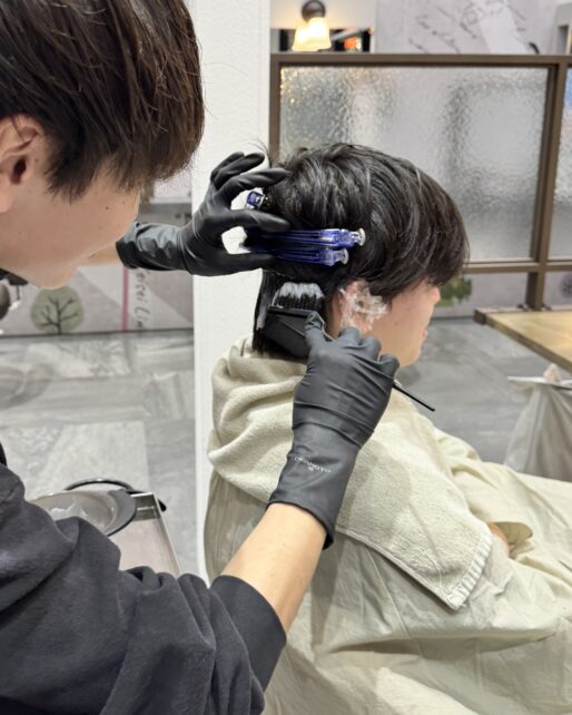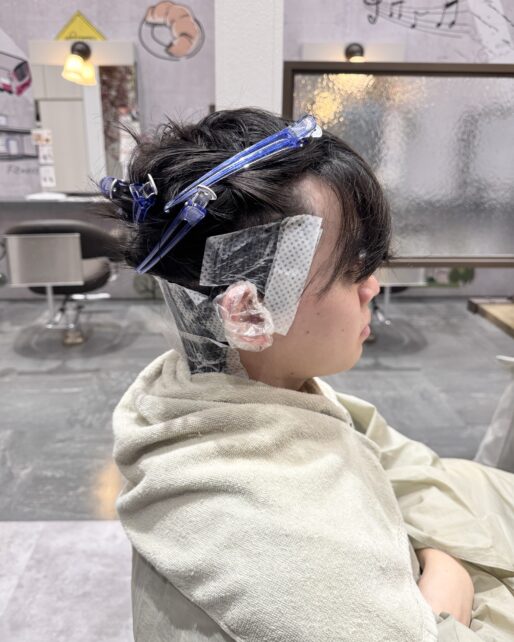 耳周り、もみあげ、生え際などしっかり薬剤を塗布していきます。 -