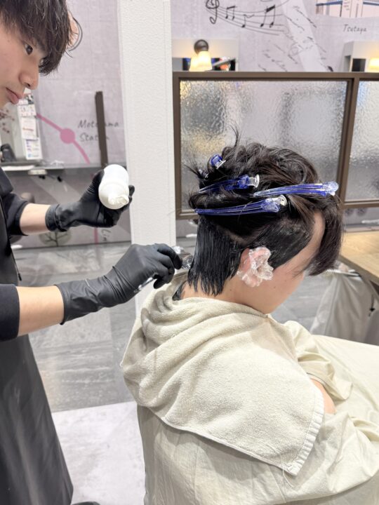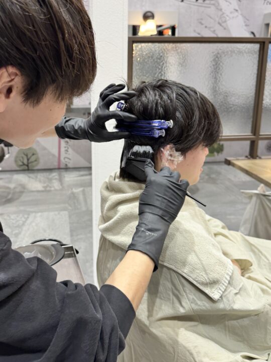 耳周り、もみあげ、生え際などしっかり薬剤を塗布していきます。 -