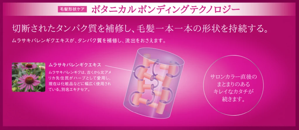 キレイな形を保つ内部補修成分として、毛髪内部に強固な結合を形成するムラサキバレンギクエキスと、3層構造の高実感被膜を形成するハイブリッドポリマーを配合。
