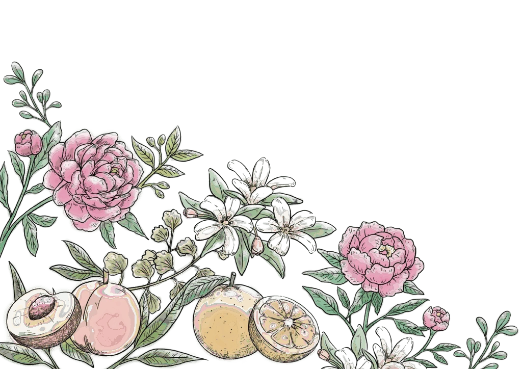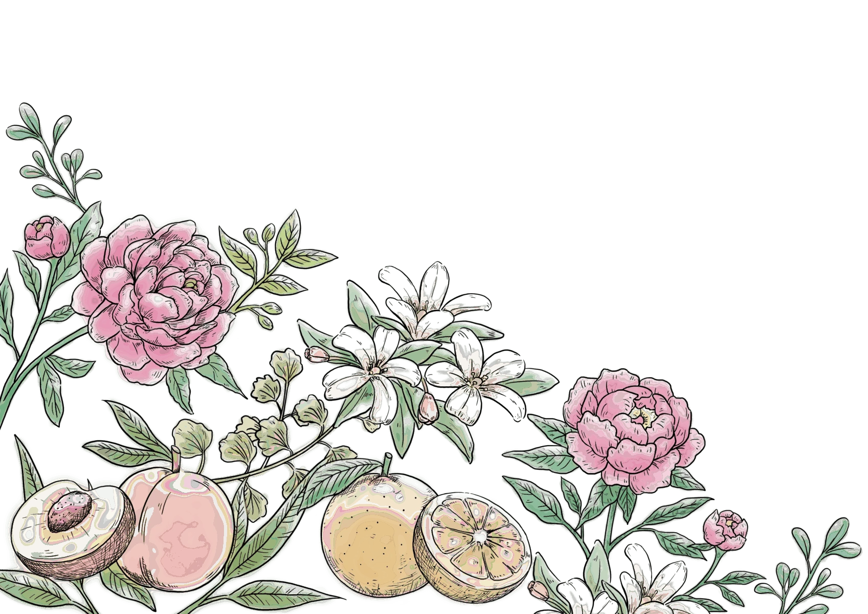 より香りに深みを出すために、2つの植物の香りをミックスしたダブルフレグランス処方になっています。果実や花のような透き通った甘さ、柑橘系の植物による爽やかさが特徴です。