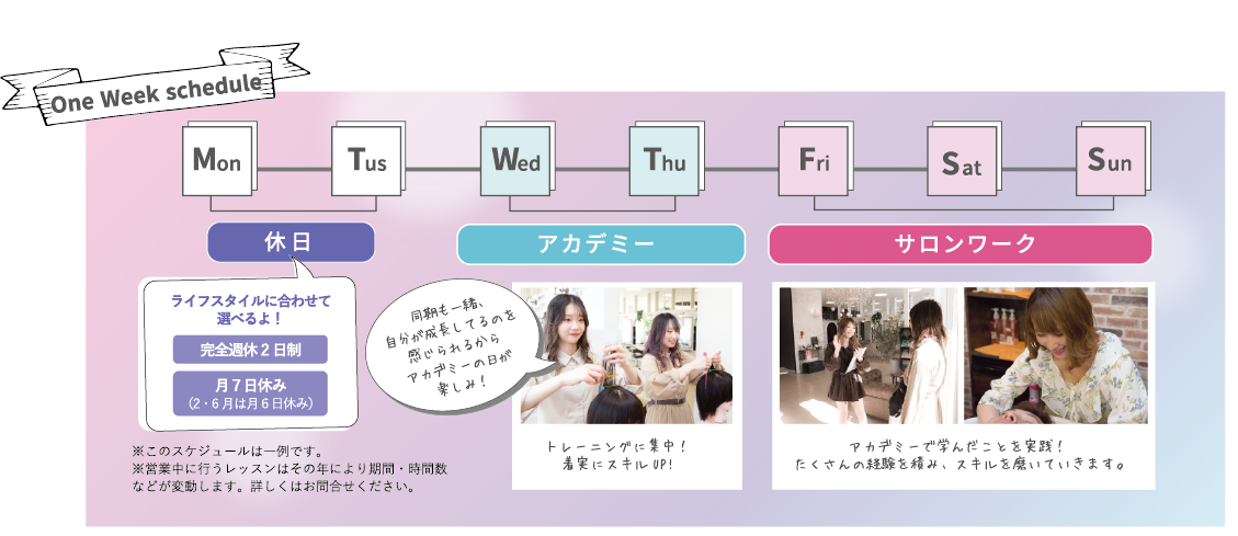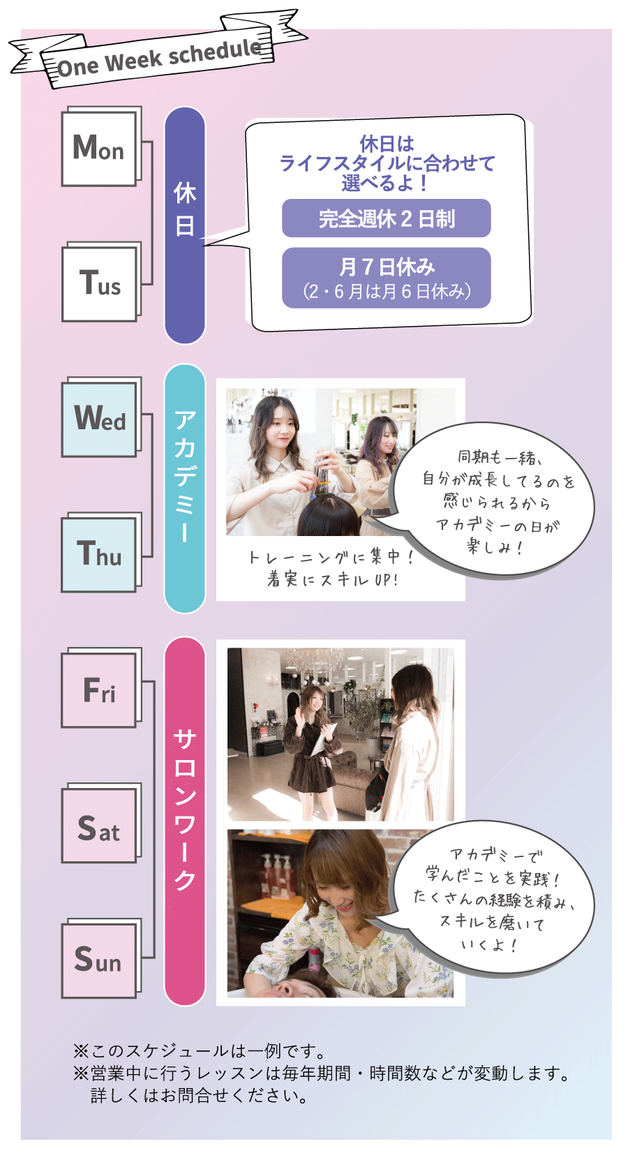 完全週休2日制or月7日休み(2.6月は月6日休み)を選べる休日システムをご用意しております。どんどんキャリアを積んで沢山のお給与をもらいたい方は少ない休みで、プライベートの充実を図りたい方は多い休みを選択する事ができます。充実の美容師ライフをお楽しみ下さい。