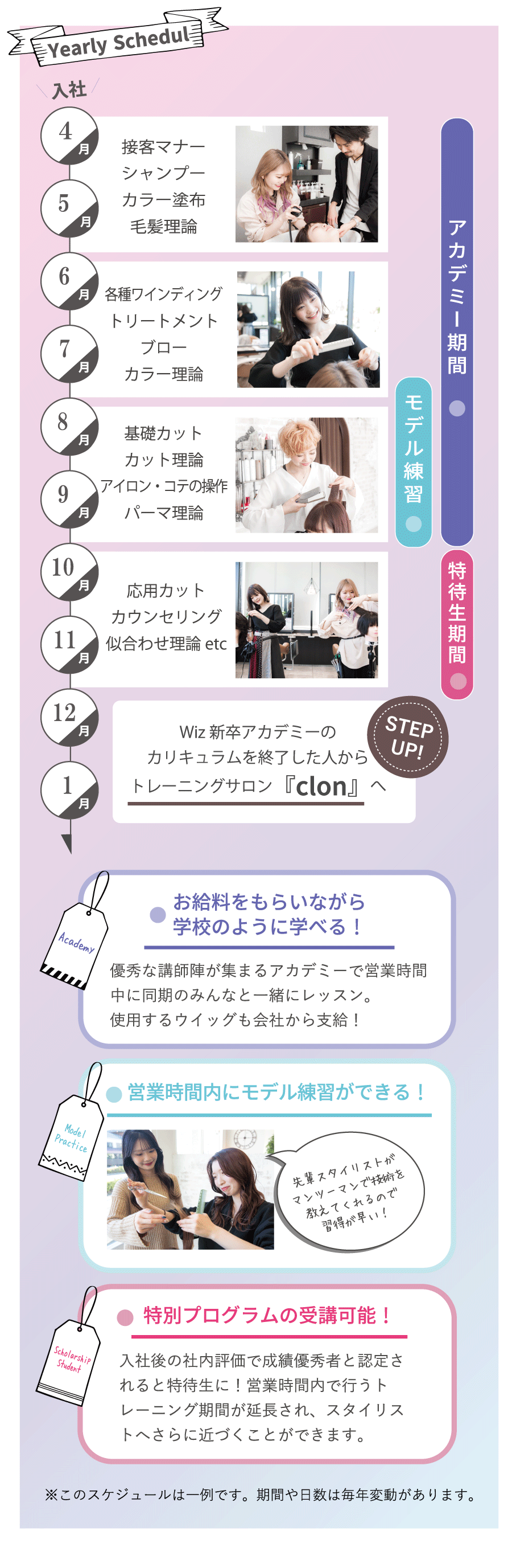 新卒で入社後約8ヶ月間は週に1~2回お給与をもらいながら営業中に技術カリキュラムを学ぶことができます。カリキュラム終了者からスタイリストとして実際のお客様を月100名以上担当することができるトレーニングサロン「clon」に行くことができます。※一般的な美容室ではカットモデル50人など1年以上かかったりしますがWizではカットモデルはぼぼ不要で50人担当まで2週間程で終わってしまうというスピードです。