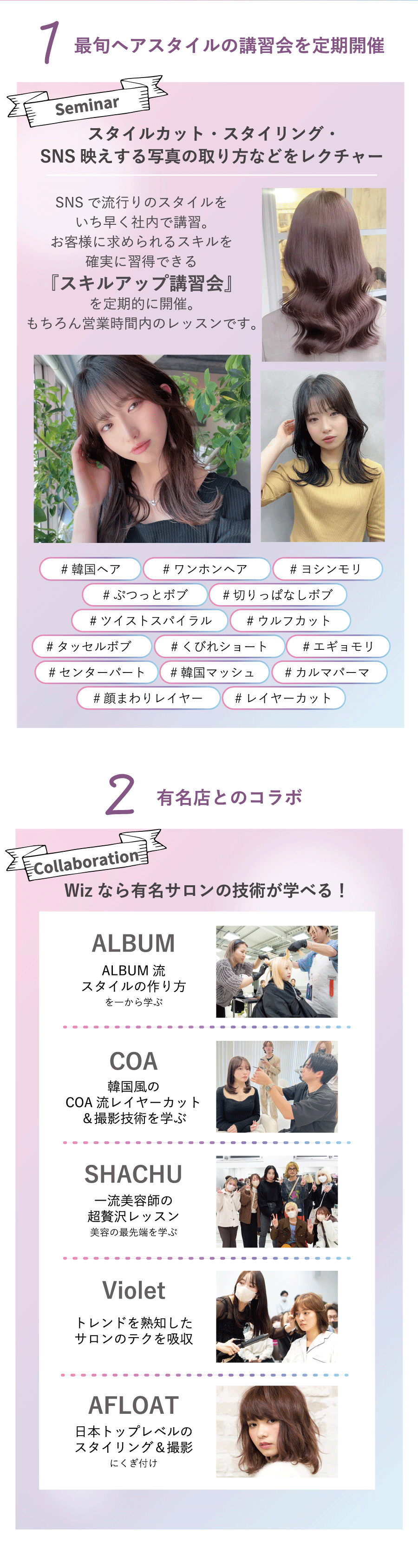 A. Wizでは様々なサロンで働いてきたスタッフが多く活躍しています。スタッフ同士で様々な技術を見たり、色々な話を聞くことで、多くの事を吸収し、学べる環境があります。